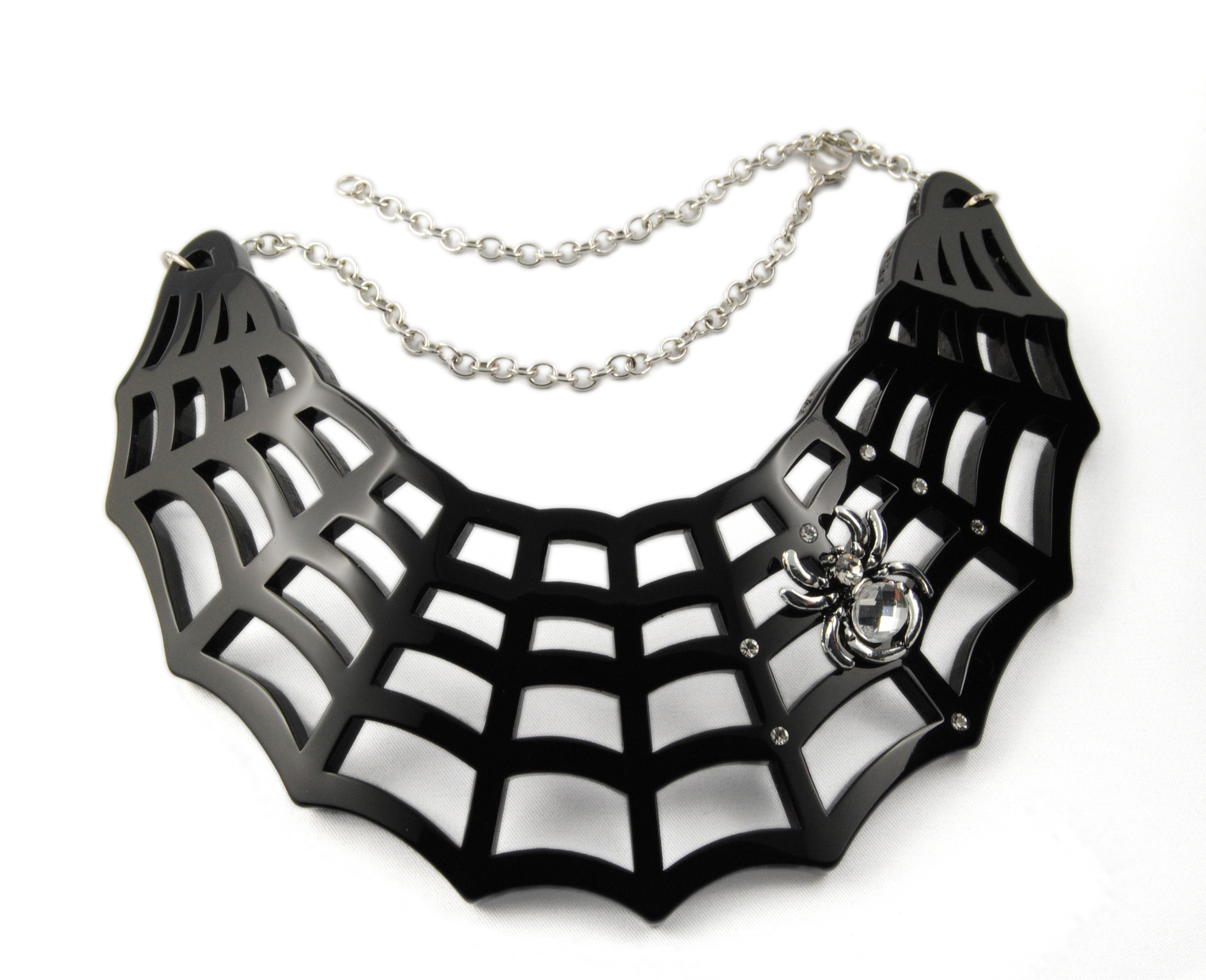 Partiamo da un accessorio perfetto per chi non ha voglia di travestirsi ma pensa che sia sufficiente un tocco di follia chic per essere perfetta il giorno di Halloween: si tratta di un collar necklace in plexiglass di Sweet Papillon, brand che ho già citato più volte, il tema è ovviamente la notte del brivido e il design è ispirato ad una ragnatela.