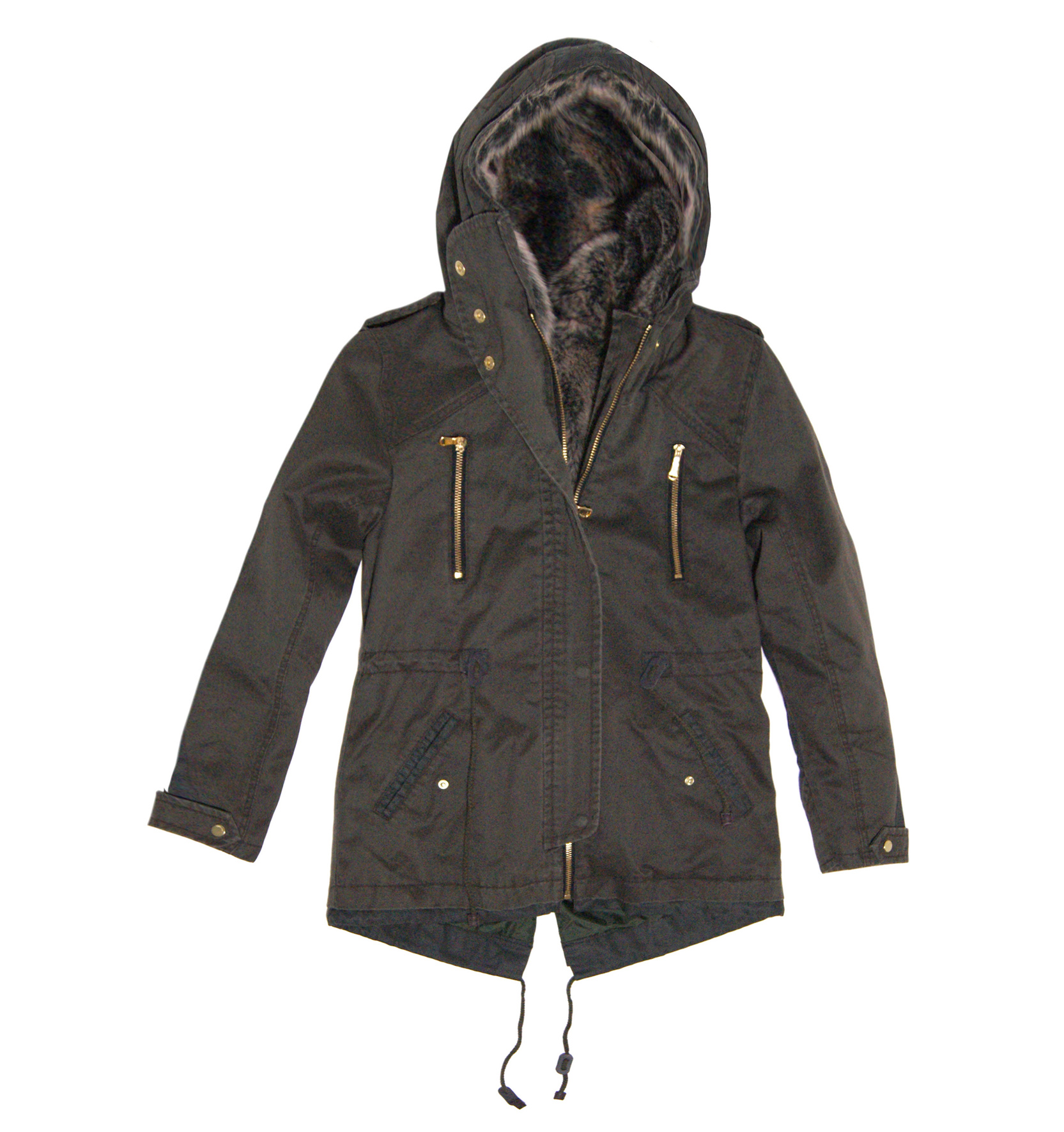 Ecco i miei preferiti della collezione: t-shirt stampata in cotone con decorazione di borchie (14,99€), Giacca/felpa verde militare in stile chiodo con cerniere (49,99€), parka imbottito con pelliccia ecologica dotato di coulisse in vita e nella parte inferiore per “modellarlo” come meglio credete sul vostro corpo (59,99€).