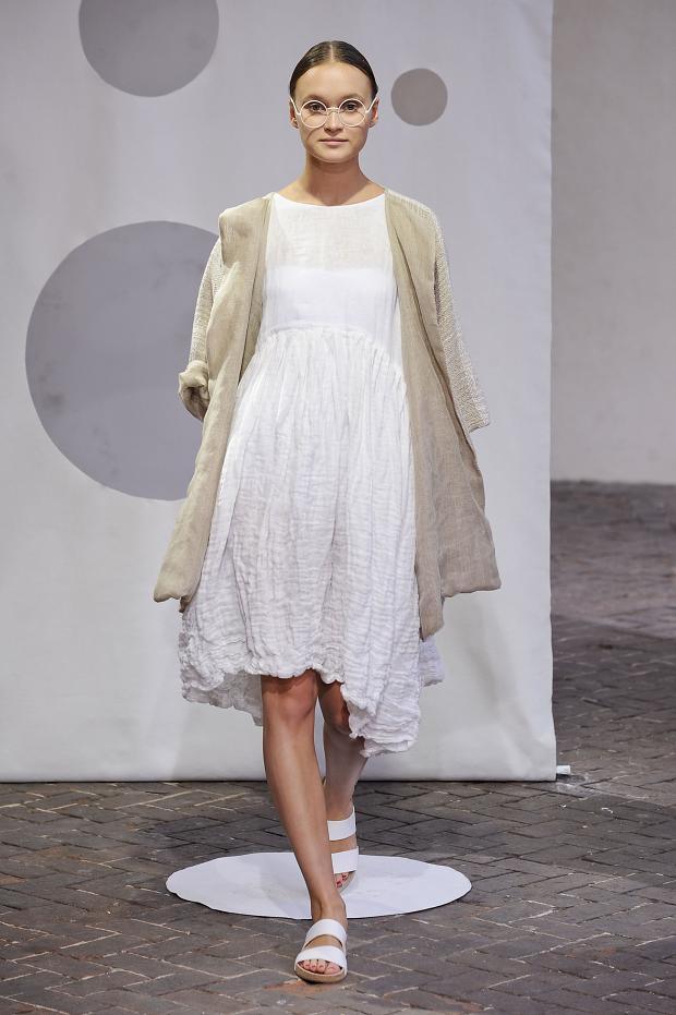 La location perfetta per il tipo di presentazione non poteva che essere il bellissimo Oratorio della Passione della Basilica di S.Ambrogio, le modelle facevano un lungo giro prima esterno nel cortile e poi all’interno dell’oratorio in una sala affrescata. La musica suonata da chitarre si legava a filo doppio con gli abiti, inizialmente dolce e quasi sognante abbinata a capi totalmente bianchi con piccoli inserti di colore sabbia e rosso. Vestiti larghi e comodi in lino e cotone completati da copri spalle e giacche, tessuti morbidi e voluminosi, onde e linee curve senza tagli netti e squadrati.