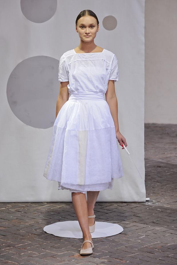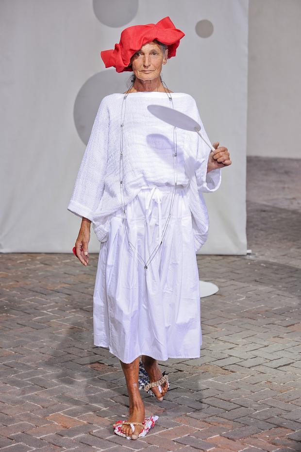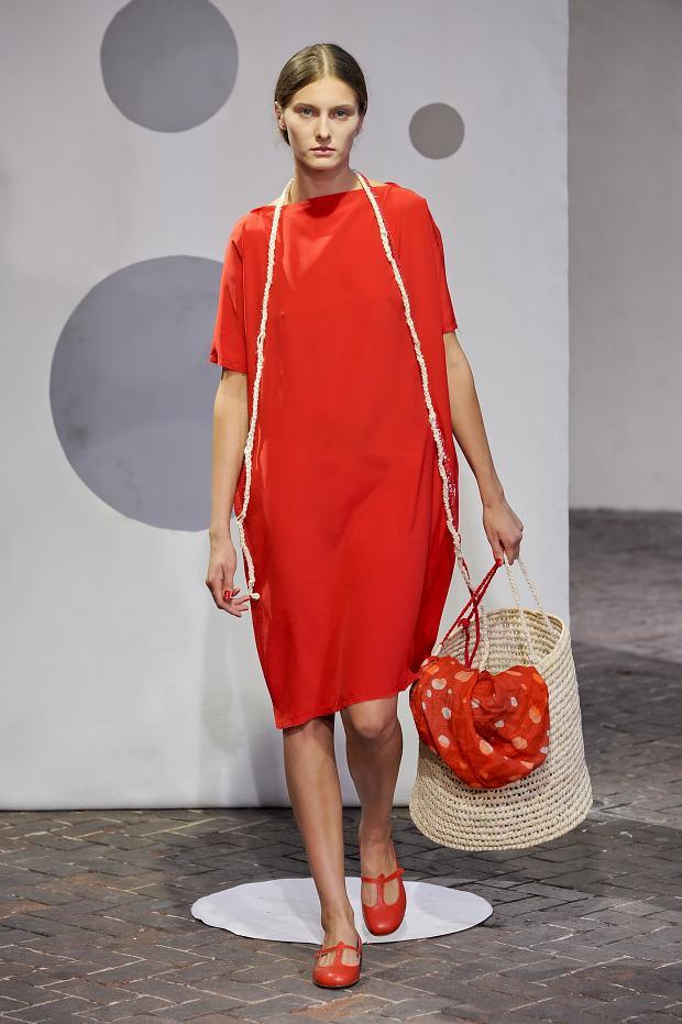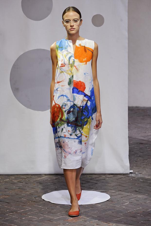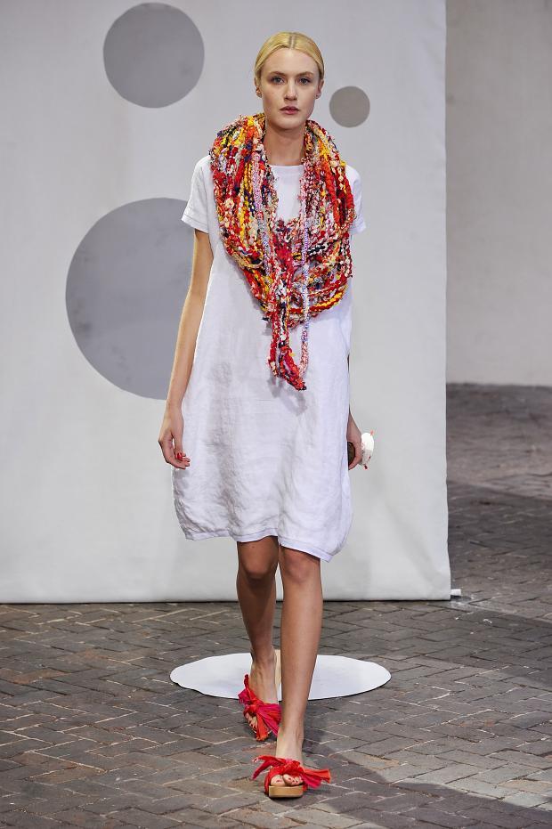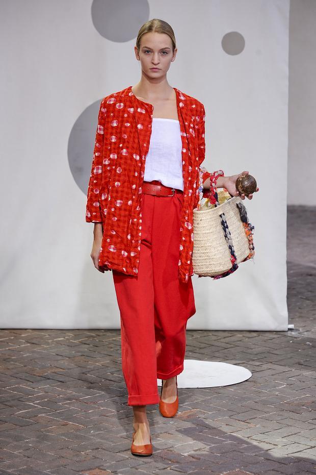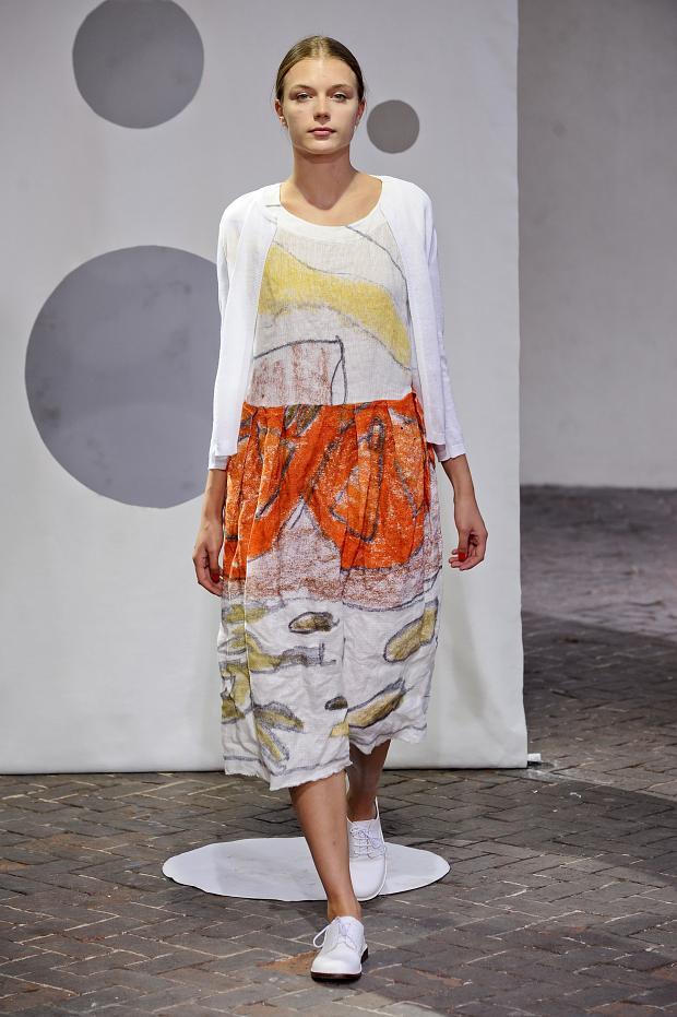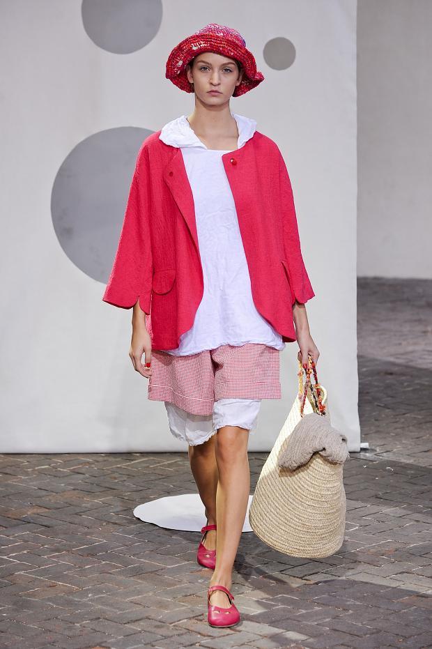Quando la musica cambia e si fa vivace, le modelle impugnano bocce di legno e vi giocano lanciandole per la sala, questa volta il colore fa da padrone, si alterna il rosso dei pomodori e il blu cina e gli abiti bianchi si ricoprono di pennellate dai mille colori e scarabocchi che ricordano quelli dei bambini. Gonne lunghe fino al ginocchio, pantaloni con taglio maschile, abitini stropicciati accompagnati da larghi cappelli per passeggiate in campagna o al mare che si adattano a qualsiasi donna, giovane o meno, che vuole vestirsi con un tocco di originalità e anticonformismo.